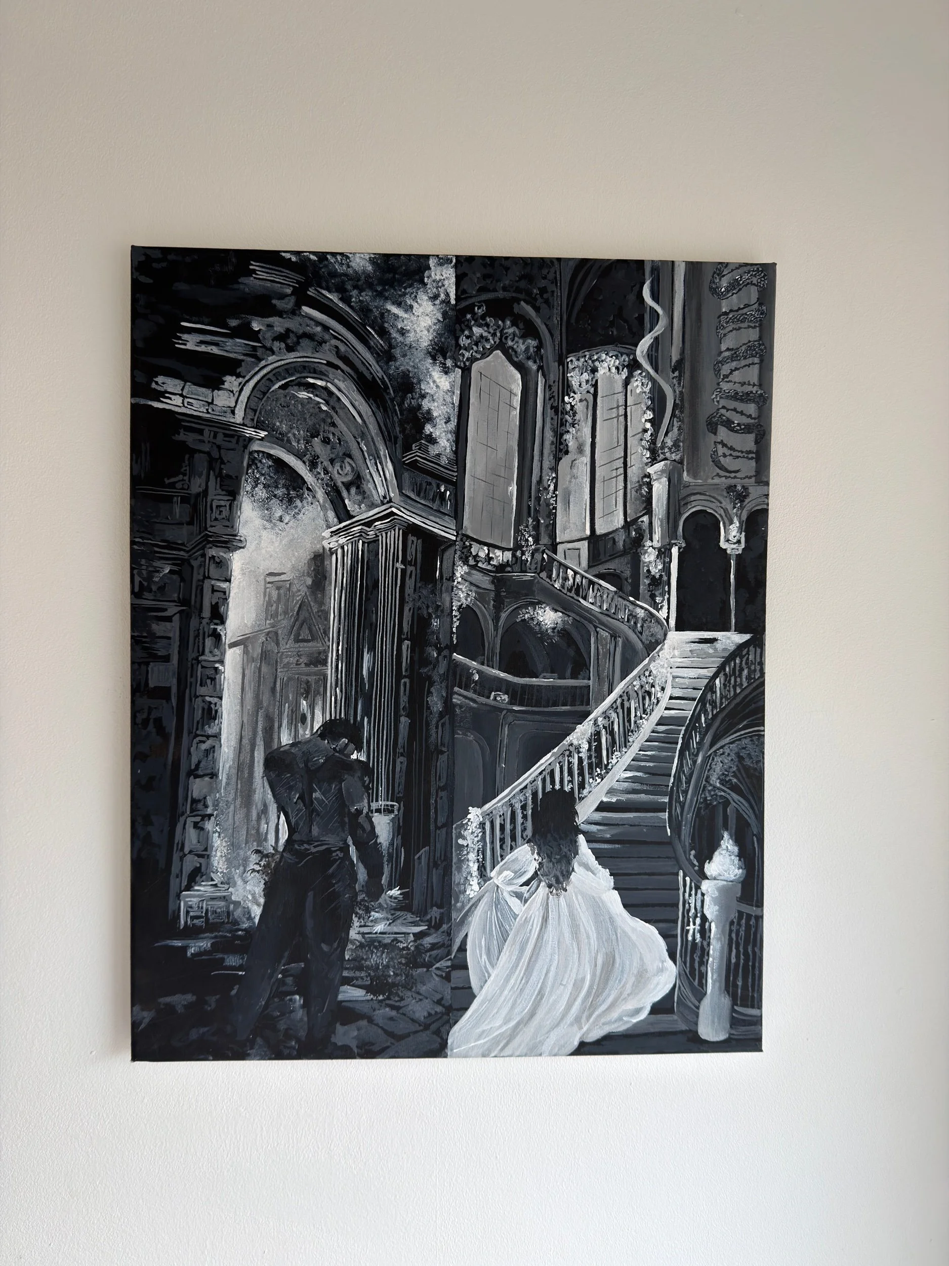 A black and white acrylic painting professionally printed onto archival smooth cotton rag art paper. Each print is carefully produced to preserve texture and tonal depth, designed for longevity on museum quality.